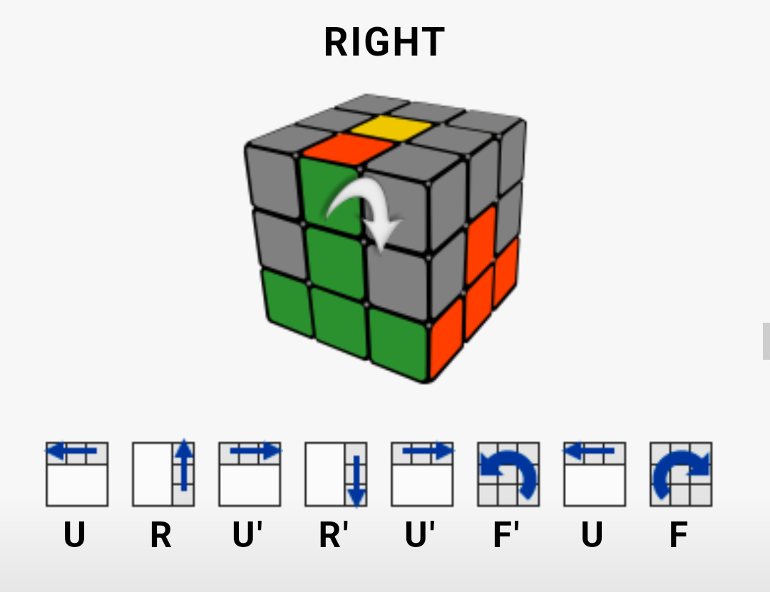 - Chose a corner where it’s wrong. Repeat RIGHT combinarion until that one is solved (it will mess up a little bit the upper, but don’t worry)